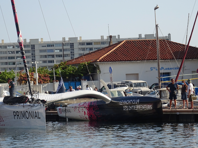 pour nous établir dans l'une des dernières brasseries juste avant le port marchand colonisé pour quelques jours par le « Pro Sailing Tour » pour assister, faute des les avoir vu faire joujou devant le Mourillon, dans la grande rade (en fait c'était parait-il un peu décevant faute de vent) au retour, tirés par des annexes des grands Ocean Fifty, splendides machines (qui partent lundi vers Brest) dont la beauté, même sans voile, est difficile à capter. https://prosailingtour.com/la-melee-des-ocean-fifty-devant-le-stade-mayol-a-toulon/