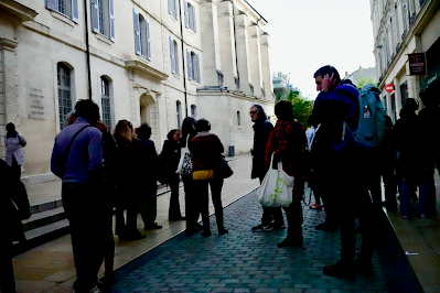 Équipés d’une petite radio et d’écouteurs nous permettant d’entendre l’acteur qui déambule dans les rues assez étroites (Carnot) et peuplées d’Avignon sur lequel descend le soir l’avons suivi… moi d’assez loin parce qu’à force de marcher en évitant de sortir des remparts en une heure et de ne pas faire de la marche une corvée ai pris de mauvaises habitudes… pendant une petite demi heure ou un peu moins avant de rentrer au théâtre pour que nous disions nos impressions et nos réactions — sur la voix (chaude et souple) en laquelle un des lecteurs du livre ne retrouvait pas la violence du roman (choix cruel d’Alexia et des co-adaptateurs résultant du parti-pris de déambulation dans les rues pour que les interférences de la population, l’éveil de la curiosité ne risquent de perturber le monologue qui, une fois sorti est récit - et la première partie pendant qu’il se cloître forcément resserrée pour que l’ensemble ait une durée raisonnable comportera toute la violence exprimée, voix, musiques etc… de la bande son  qui est en cours d’élaboration) — en la difficulté de voir par ses yeux mais quand le dialogue intervient de sentir la différence entre la voix objective et la voix subjective, de déambuler dans la ville (décision prise pour le moment : faire intervenir un dialogue enregistré ce qui crée une légère distorsion de la voix)  — les adaptations pour l’insertion du spectacle et des spectateurs dans le décor de la ville, avec des interférences qui seront les bienvenues mais en maintenant une certaine cohésion de ceux qui sont là pour avoir décidé d’assister au spectacle :,nos casques éveillaient une curiosité gentille, mais ont entre autres avantages celui d’empêcher les saluts amicaux à l’acteur qui ne manque pas d’amis dans Avignon ou au moins de justifier sa non réaction — sans compter l’idée qui m’est venue : le spectacle devant avoir un minimum de rentabilité il faut bien que les spectateurs venus pour lui se repèrent y compris dans la foule du festival et puissent de temps en temps prendre du retard en voyant pat les oreilles — parti pris également de prévoir avant l’espace final des moments où les spectateurs pas forcément capables ou désireux de supporter froid neige etc… pendant la longue durée qu’aura la déambulation (même écourtée) aient des moments de repos. Le travail est prévu jusqu’à l’été 2026 vraisemblablement (tout ceci étant ce qui mon petit cerveau a compris)